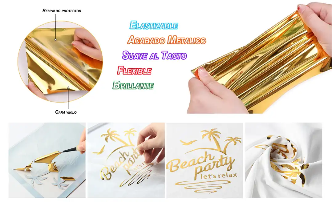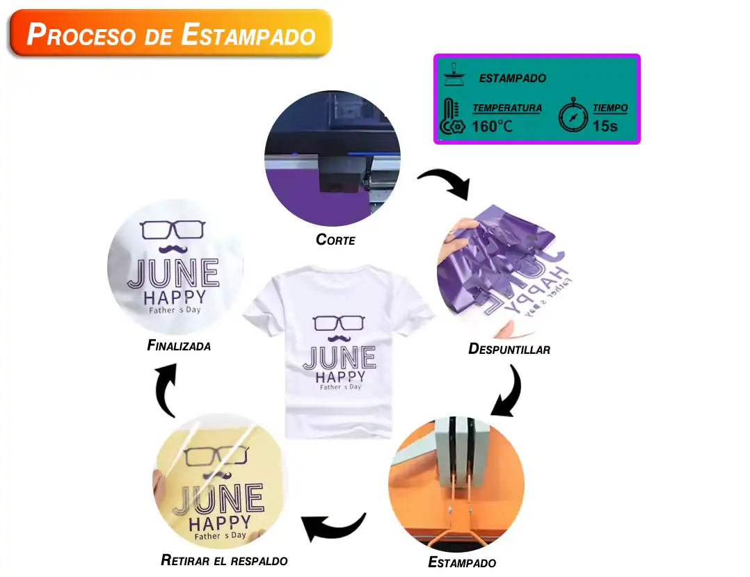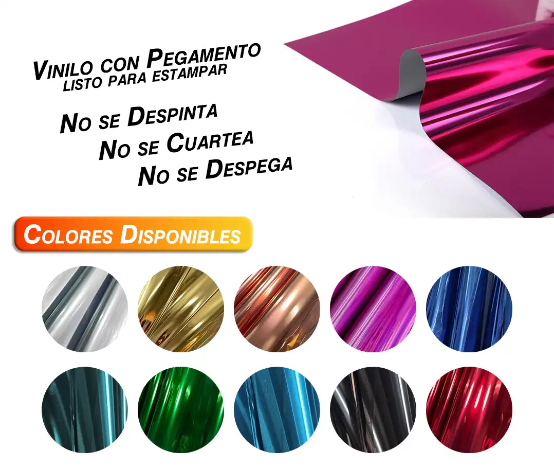 ESPECIFICACIONES: -Se corta con Plotter de corte -El diseño recortado se transfiere por medio de calor -Color: Diferentes a elegir, ver carta de colores. -Efecto: Engomado, metalizado -Textura: SUAVE, excelente confort, no se siente al tacto, ligero y no incomoda al uso. DATOS DE ESTAMPADO -Temperatura: 150ºC a 160ºC aproximado. -Tiempo: 16 Segundos. Aproximado. DATOS DE APLICACIÓN -Pegar sobre tela que no tenga pelusa. Tela apto para aguantar altas temperaturas. Usada en prendas de vestir para personalización - decoración – parches – apliques.